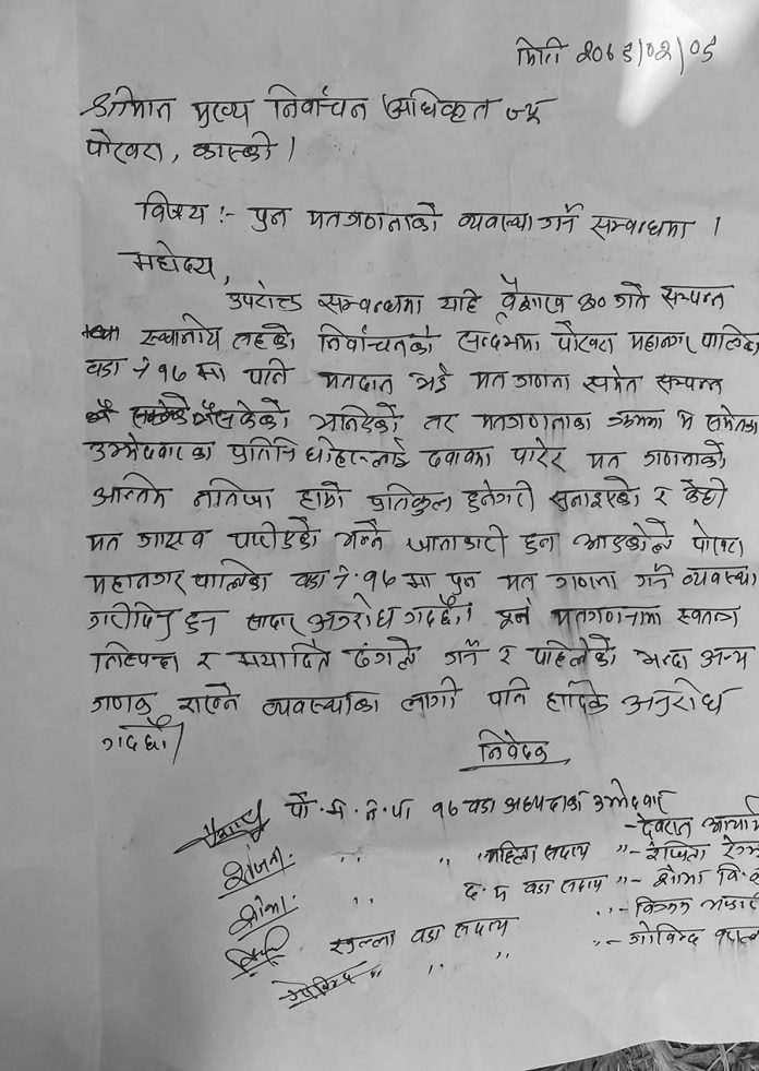 पोखरा: पोखरा महानगरपालिकामा वडा नम्बर १८ मा एमालेले ९ मत हराएको भन्दै पुनः गणनाको माग गरेपछि कांग्रेसले काउण्टर निवेदन दिएको छ । कांग्रेसले १ र १७ नम्बर वडामा पुनः गणनाको माग गरेको हो ।