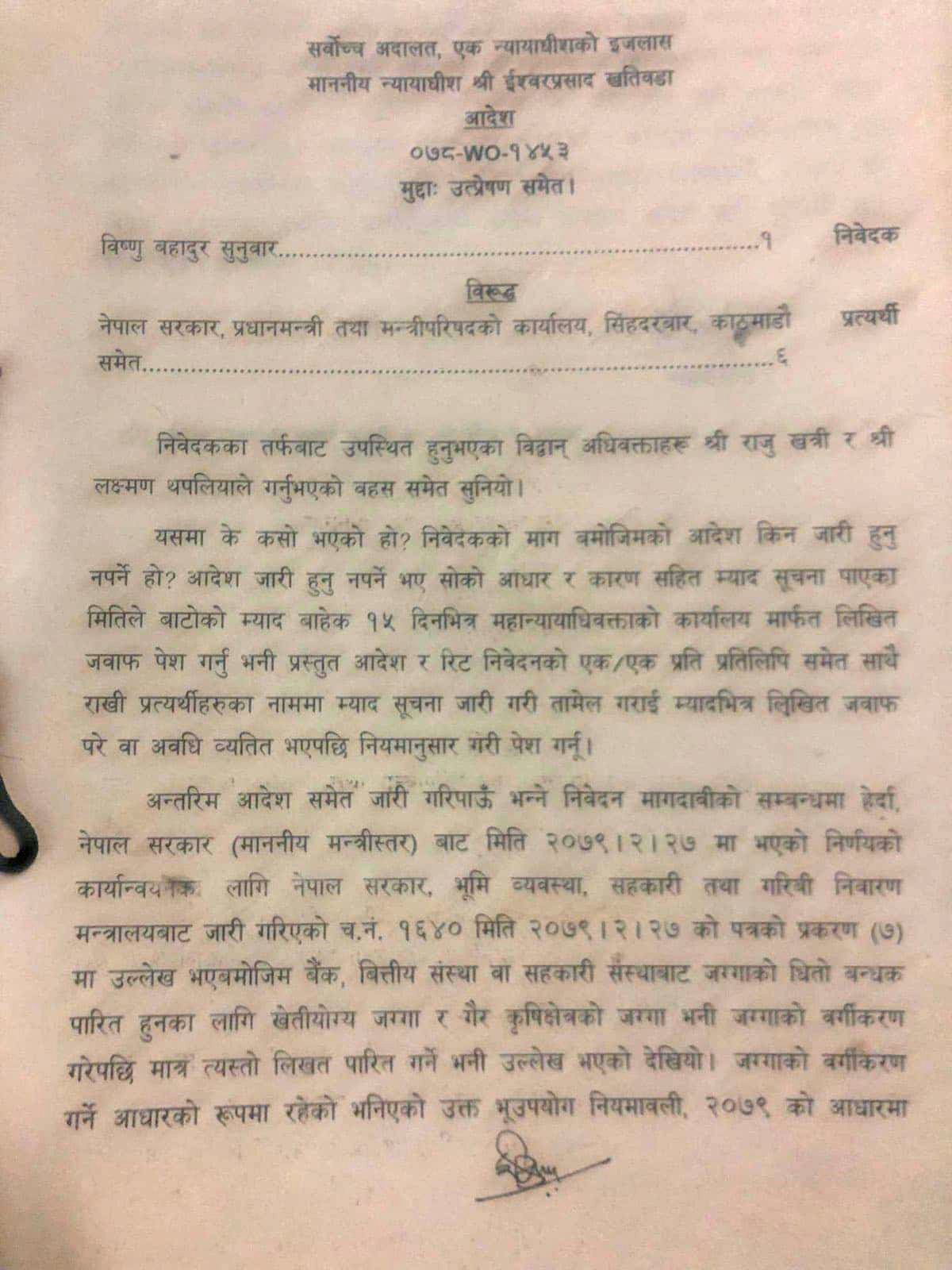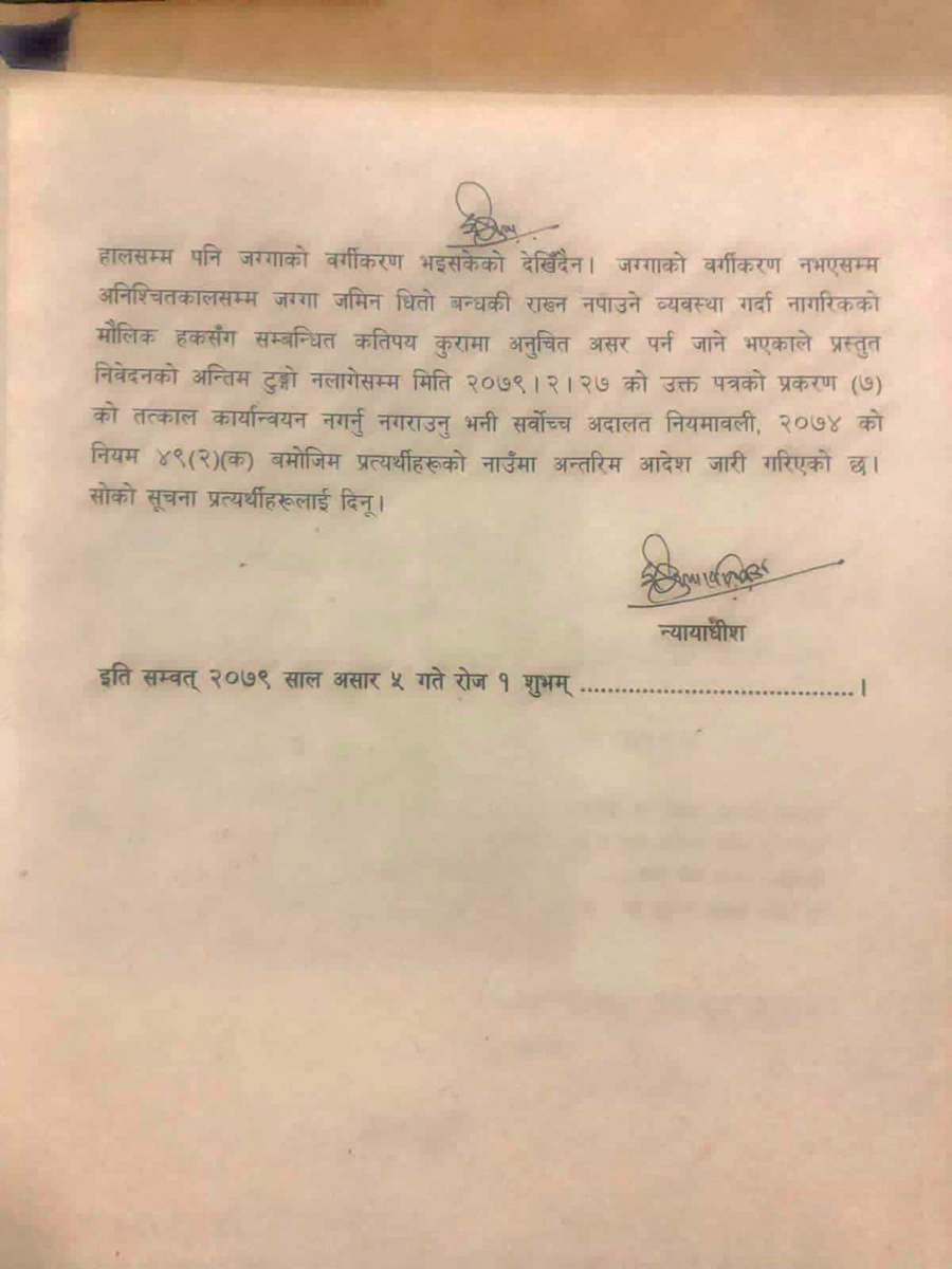 जग्गाको बर्गीकरण गर्ने आधारको रुपमा रहेको भू-उपयोग नियमावली २०७९ को आधारमा हालसम्म पनि जग्गाको वर्गीकरण नभइसकेको र अनिश्चितकालसम्म जग्गा धितो बन्धी राख्न नपाउने व्यवस्था गर्दा नागरिकको मौलिक हकसँग सम्बन्धित कुरामा अनुचित असर पर्न जाने सर्वोच्चको आदेशमा उल्लेख गरिएको छ ।