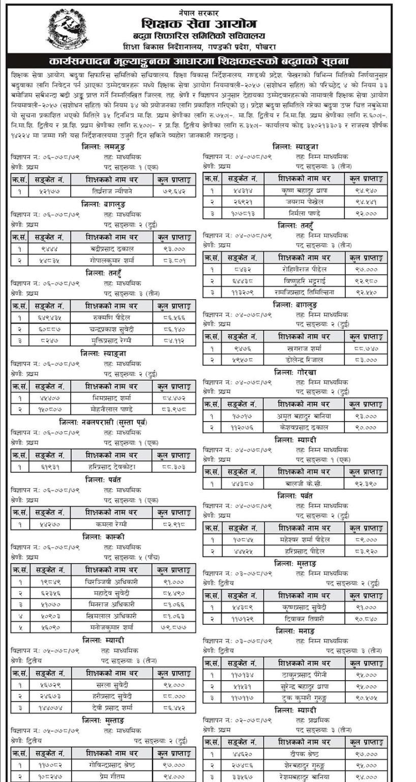 शिक्षक सेवा आयोग बढुवा सिफारिस समितिको सचिवालय, शिक्षा विकास निर्देशनालय गण्डकी प्रदेश पोखराको विभिन्न मितिको निर्णयानुसार बढुवाको लागि निवेदन दिएका ४१ जनालाई बढुवा गरेको सूचनामा उल्लेख छ ।