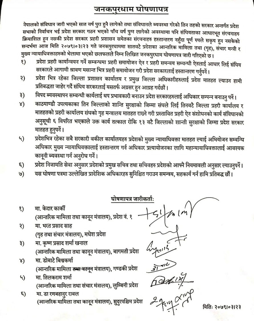 ‘काठमाडौं उपत्यकाका तीन जिल्लाको शान्ति सुरक्षाको जिम्मा संघले लिई तीन वटै जिल्ला प्रहरी कार्यालय र मातहतको प्रहरी कार्यालय संघको गृह मन्त्रालय मातहत राख्ने गरी प्रस्तावित प्रहरी ऐन संशोधनको कार्य संविधानको अनुसूची ६ विपरीत भएकाले उक्त कार्य तत्काल रोकी १३ वटै जिल्लाको शान्ति सुरक्षाको जिम्मा प्रदेश सरकार मातहत हुनुपर्ने,’ घोषणापत्रमा भनिएको छ।
